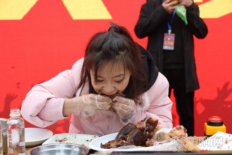 随后,首届“牛蹄关杯”大胃王美食争霸赛总决赛开始,一盘盘毛肚、牛蹄、牛肉、桑叶馒头等幺铺特色美食相继上桌。选手们同时按下计时器,各路吃货、老餮胃口大开,现场观众喜笑颜开,氛围热烈。