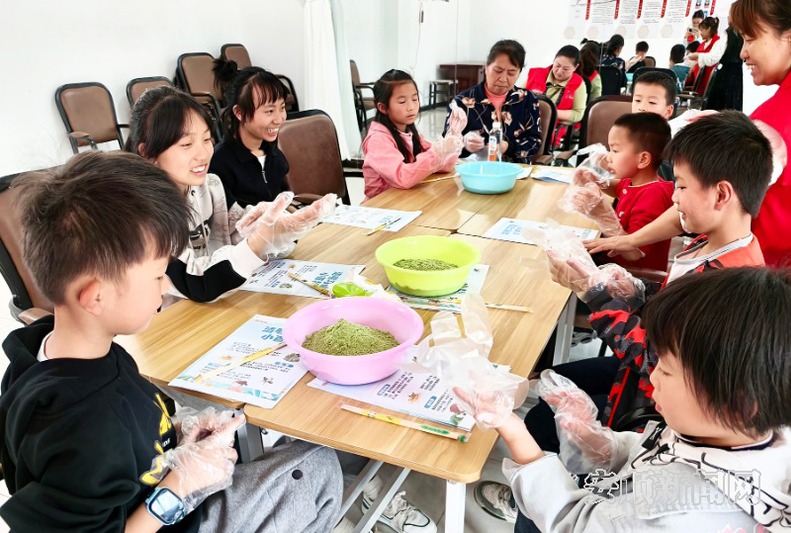 志愿者们为孩子们悉心讲解清明节习俗知识后,开展了“巧手做青团 浓情寄清明”清明节主题活动。“捣青草为汁,和粉作团,色如碧玉。”在学习青团的制作过程后,孩子们拿到青团粉、馅料和包装盒,在志愿者的指导下,开始揉面、包青团,不一会儿,一个个青团在大家的巧手下成型,整齐地摆在了盒子里。