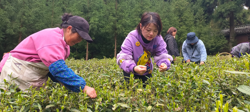 平坝区果蔬茶叶蚕桑站站长、高级农艺师王菊在海巴塘茶园指导农户双手采茶