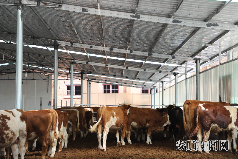 近日,记者走进位于安顺经开区幺铺镇的贵州聚福牛源养殖有限公司,看见一栋栋红墙黑瓦的房子,如同“别墅”一般映入眼帘,几台机械化饲喂车正在投喂种牛,膘肥体壮的牛儿低着头悠闲地咀嚼饲料。
