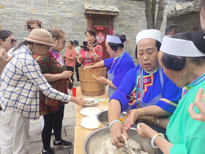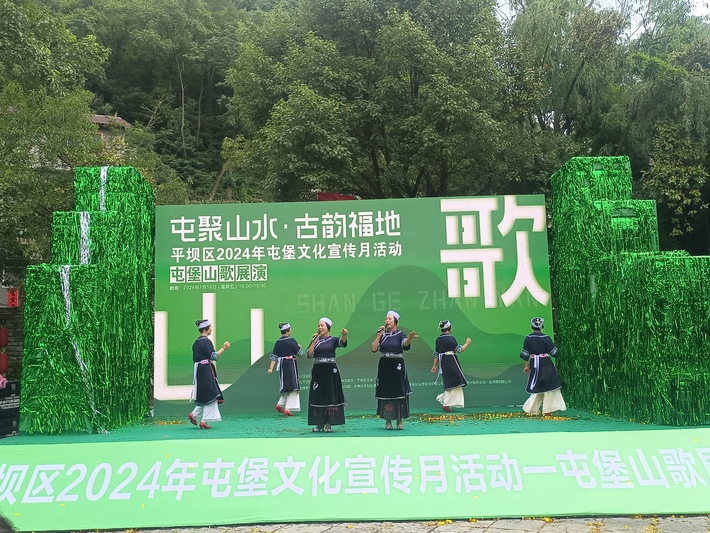 一路上,非遗屯堡山歌文化介绍展示区域吸引众人驻足,山歌的句式、歌唱的形式、独特的口头文学以及口口相传的教习方式让游客们交口称赞。百闻不如一见,在天龙学堂前的山歌展演台上,来自本土的屯堡山歌歌手何金凤、姜艳子等将一首首旋律欢快的歌曲唱响:“天龙屯堡好风光,大家齐聚把歌唱;山好水好人更好,首首山歌感党恩…”一曲唱罢,台下观众掌声四起。
