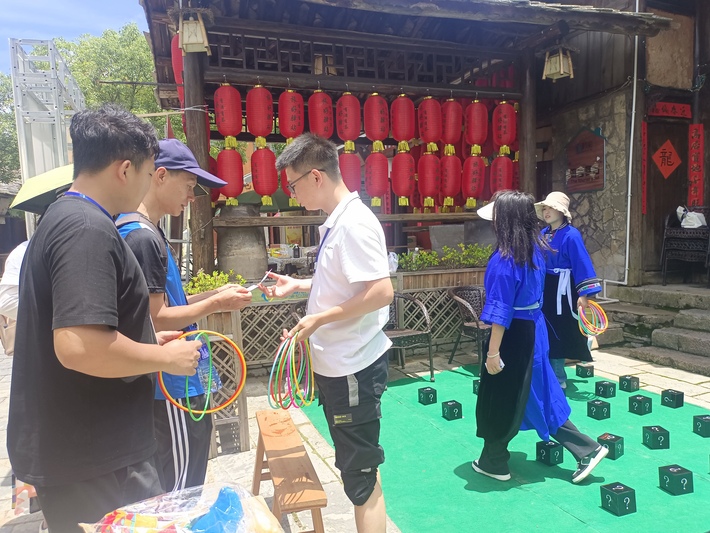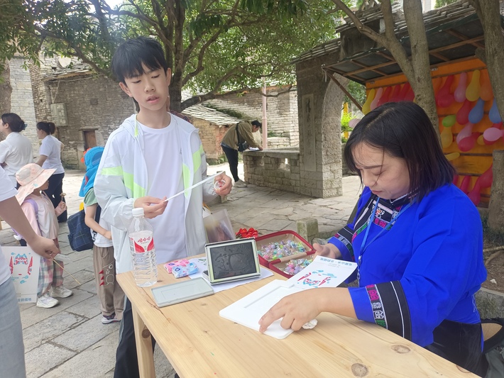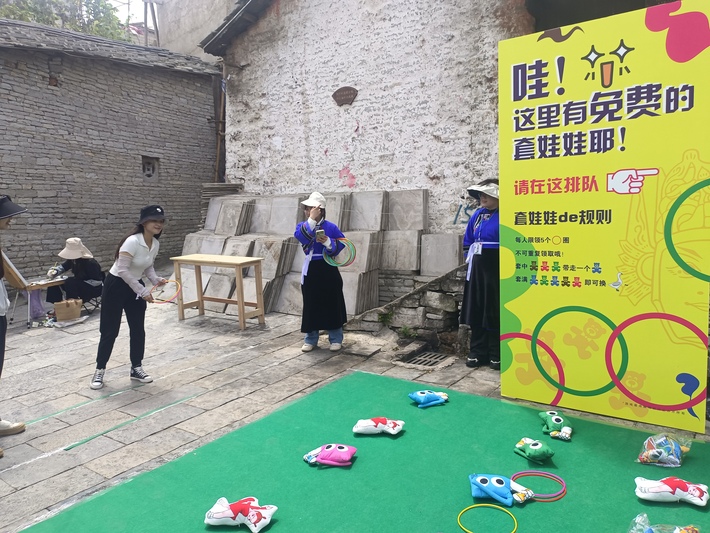 在活动现场,阳光明媚,来往的游客络绎不绝。从一进景区大门到演武堂这条主观光路线,通过设置屯堡文化创意打卡区、集章活动打卡点,套盲盒、套娃娃、跳房子、拓印、民俗活动体验等活动吸引游客参与。