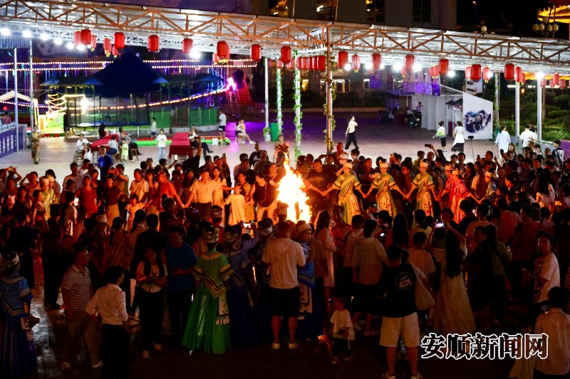 当夜幕降临,在欢快的音乐声中,神骏大剧院前的广场上燃起炙热的篝火。游客在观看演出后,演职人员与游客们手拉手围在篝火旁跳起了竹竿舞,共享热烈融洽、欢乐和谐的美好时光,篝火晚会将夜的氛围推向更高潮。