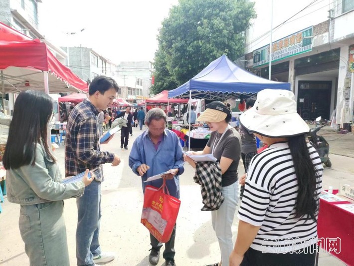志愿者向赶集的群众发放移风易俗宣讲资料