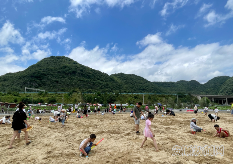 在沙滩区域,沙滩寻宝活动也正如火如荼地进行着。游客们手持小铲子,在沙滩上仔细搜寻,希望能找到宝藏。幸运大转盘和爱国知识问答活动同样受到了游客的热烈欢迎,大家纷纷排队参与,争取赢得丰厚的奖品。