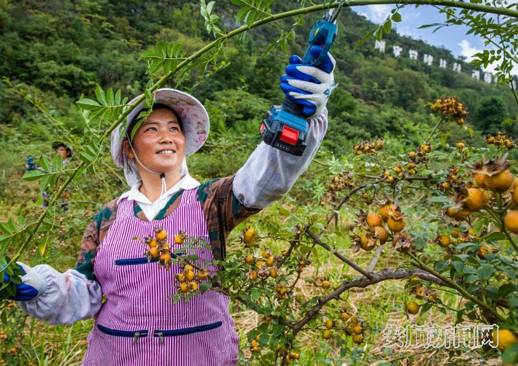 10月,是金刺梨大量丰收上市时节,双堡镇大坝村几千亩金刺梨基地一片金黄,村民许忠义和其他村民戴着手套,拿起剪子,熟练地剪下一串串金刺梨,他们在家门口“上班”,按斤计酬,每天采摘300斤,能得150元务工费。