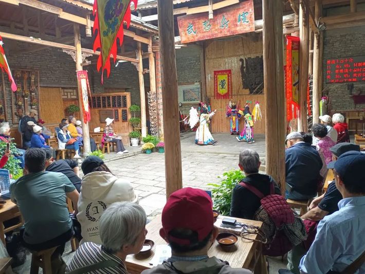 除了完善景区内基础设备设施,屯堡文化表现形式之一的“屯堡地戏”表演也正按照每天9场次在锣鼓声中准点开场。在景区演武堂,来自7个国家的华侨华人观光旅行团正在观赏屯堡地戏表演《三英战吕布》。台上演员们头顶面具,面罩青纱,背插战旗,手持刀、枪等兵器,在铿锵的锣鼓伴奏中相互唱、和、舞、打,台下观众们看得目不转睛,掌声连连,大家纷纷拿起手机记录这精彩的表演时刻。“今年暑期旅游旺季,到天龙屯堡景区游玩的游客较往年有大幅提升,很多游客慕名‘屯堡地戏’而来。在每天的表演间隙,我们会组织所有地戏演员们集中熟识各表演剧情的唱腔唱词,认真琢磨武打动作等。”演武堂堂主陈春伍说。