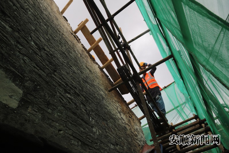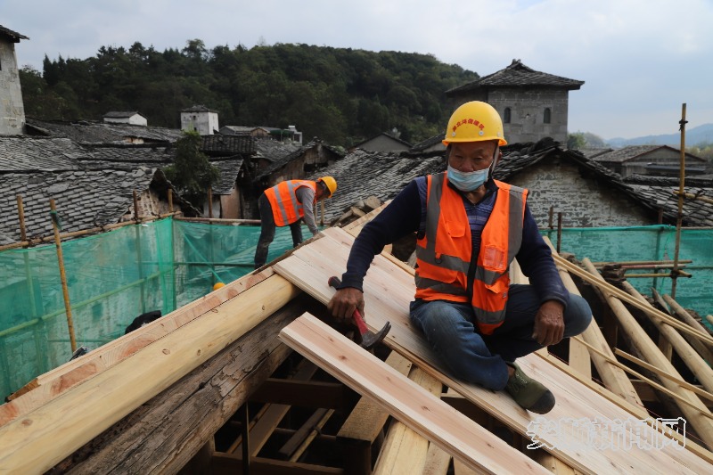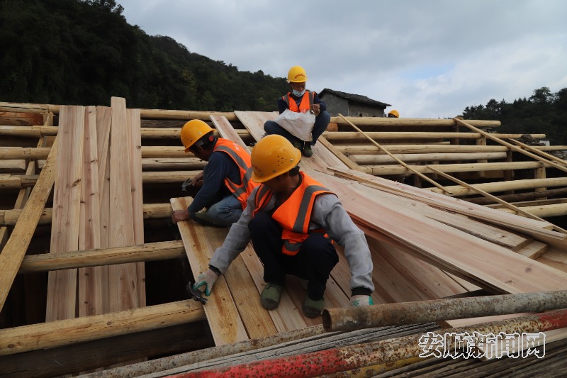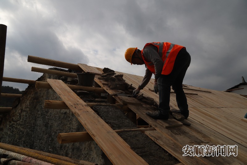 11月13日,记者在西秀区七眼桥镇本寨村看到,工人们正在对一栋屯堡的“合院”建筑进行修缮。据介绍,本次修缮按照“原址保护、修旧如旧”原则,对四合院主体破损的木柱、檩条、屋面等按古建筑修复标准进行维修,预计年底完工。(安顺日报融媒体中心记者 卢维 摄)