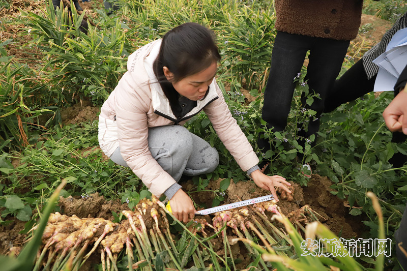该项目由市农业技术推广站牵头,镇宁自治县农业农村局、江龙镇农业服务中心参与,选取100亩生姜种植示范田开展项目研究。验收现场,试验田小黄姜长势良好而均匀,测产验收小组专家随机抽取上、中、下等各1块姜田进行一次性实采实收测产,测量姜块大小、剪茎去泥、称取鲜重。