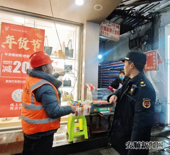 “为确保春节期间城市秩序良好,便于市民出行、交通顺畅,摊点经营有序、环境干净整洁,营造喜庆、文明、祥和的节日氛围,我们结合工作实际,以‘惠民’‘利民’‘便民’为工作出发点,主要围绕乱摆、乱放、市政设施安全问题、燃气安全问题、环卫、园林绿化方面进行巡查。”平坝区城市管理局城管监察大队副大队长所婷介绍。