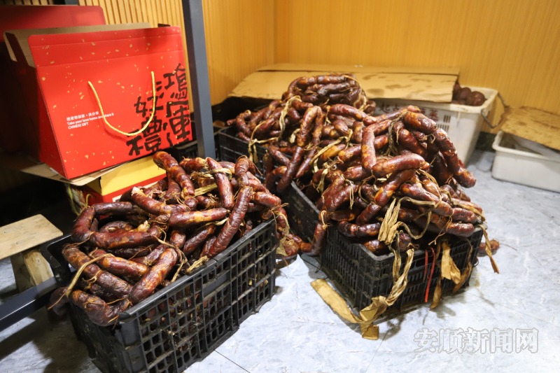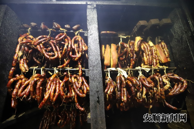 “无腊不成冬,无腊不成年。”日前,记者走进普定县白岩镇讲义村的阿妹山庄,一排排腌制好的猪肉和香肠整齐悬挂,在烘房里经过一周的“烟熏火烤”,逐渐呈现出红润油亮的色泽,散发出浓郁的烟熏香气,满载着春节团圆的温馨记忆和浓厚的传统年味。