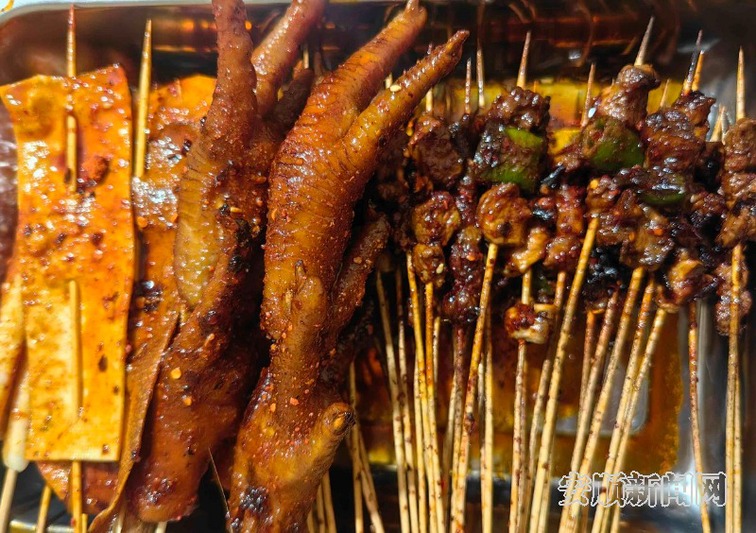 近日,记者来到西秀区大西桥镇的大西桥屯堡夜市街,街道两旁的店铺和摊位包含各类宵夜,一片热闹景象。行至九溪烤小肠店,只见三五成群的食客围坐在一张张桌前,新鲜的小肠在烤架上滋滋作响,油脂滴落,让人食指大动。