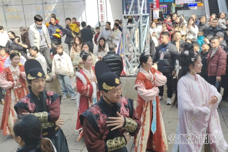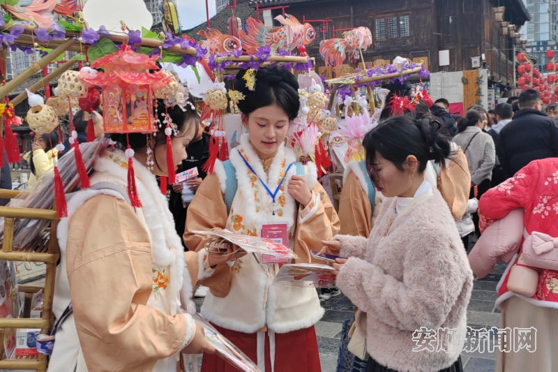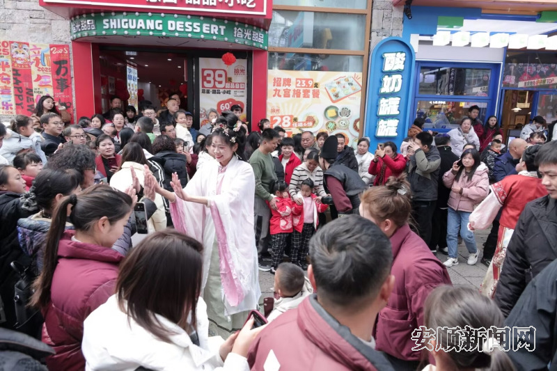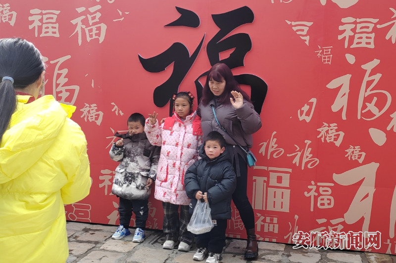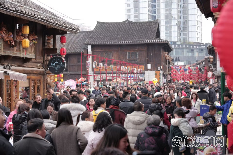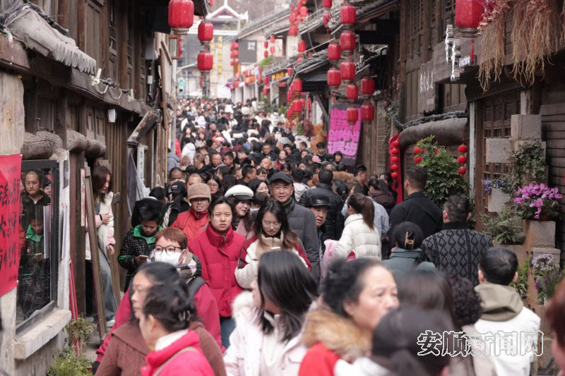 大年初一,阳光暖煦,安顺古城历史文化街区年味浓郁,一排排大红灯笼在风中摇曳,把古城装扮得格外喜庆,一路上人头攒动,热闹非凡。