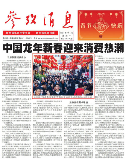 《参考消息》在《中国庆祝蛇年春节“热闹非凡”》一文中,报道了各地游客春节期间游览安顺古城的火爆场景,这也是《参考消息》连续第二年报道安顺古城迎新春活动热烈氛围,2024年2月12日《参考消息》头版刊发《中国龙年新春迎来消费热潮》一文中,同样报道了游客在安顺古城历史文化街区游玩打卡、欢度新春的热闹场景。
