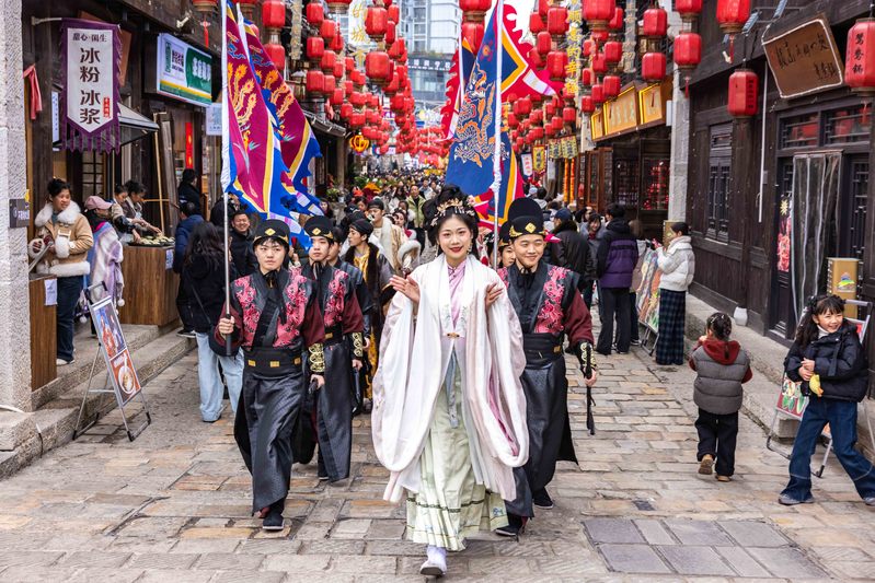 《新华每日电讯》在《拜年新风尚 出游新“时髦”》一文中,报道了安顺古城开展汉服巡游迎新春活动,丰富多彩的春节文化活动集中展示了令人流连忘返的“安顺年味”。