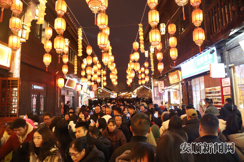 1月31日,农历正月初三,记者来到安顺古城历史文化街区,夜幕之下,灯火辉煌,游人如织,浓厚的节日氛围扑面而来。