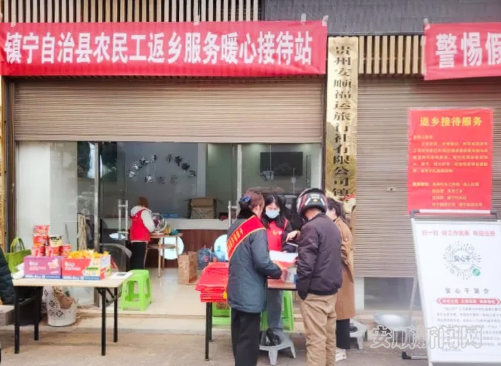 春节期间,在镇宁客车站,“镇宁自治县农民工返乡服务暖心驿站”专为外出务工返乡人员开展农民工暖心服务活动,宣传就业创业政策。