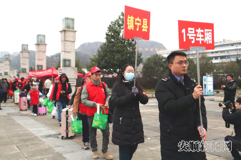 为开好免费“点对点”返岗务工专列,我市人社局积极发挥村、劳务协作站、部门宣传动员作用,组织外出务工人员积极报名,各县区组织大巴车集中输送至安顺高铁站乘车,同时,为现场每位外出务工人员发放面包、水果、方便面、旅行包等“爱心包”。
