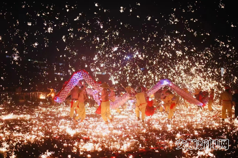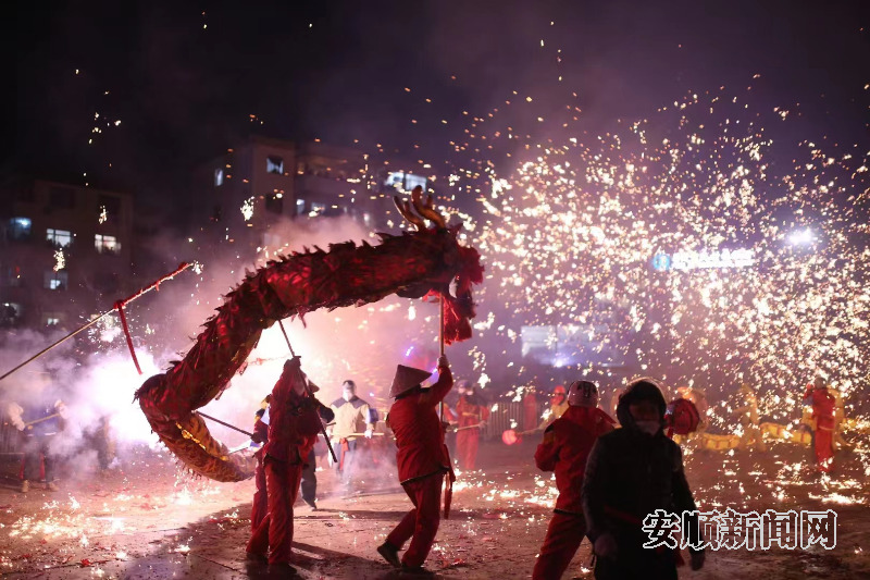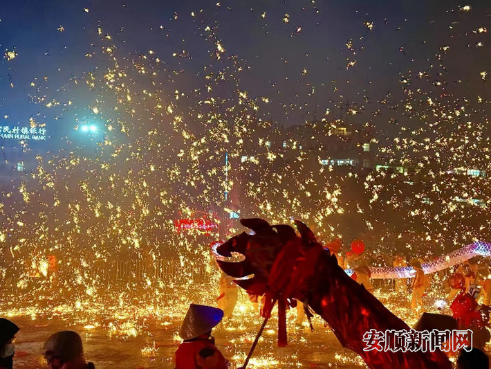 2月12日元宵节,“四季普定·文城之春”铁水冲龙主题文化周迎来了最后的“重头戏”——非遗铁水冲龙展演,参与展演的龙队齐聚普定县体育场,呈现了一场火树银花、铁火流星的壮丽美景。