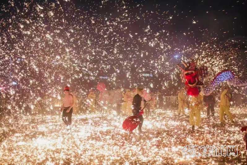 祥龙祈福,铁花献瑞。民俗味十足的巡游表演结束,烟花喷涌,鞭炮齐鸣,伴随着激越的鼓点和热烈的欢呼,火红的铁水被匠人奋力击打,瞬间绽开成漫天金雨点亮夜空,铺天盖地地洒落下来,引得现场观众连连惊叹,纷纷发出欢呼声、喝彩声。