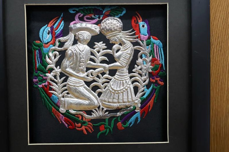 由于毗邻云峰屯堡景区、交通便利,加上精湛的制作工艺,胡天文的银饰产品广受市场欢迎,而他在制作传统屯堡银饰时,不断根据市场需求调整银饰产品的类型,进行工艺创新。“除了传统的屯堡银饰七大样外,我们创新推出了造型、花纹新颖的银壶、茅台银杯,同时将银饰与陶瓷相结合,开发出瓷包银茶杯,将屯堡银饰制作工艺与刺绣、蜡染等工艺相结合,制作成具有屯堡文化特色的银画。”胡天文表示,银画一般选取安顺典型建筑、景点、地戏、农耕丰收、节日庆典等元素进行创作,同时还承接游客定制银画,目前一共推出了70余种银画作品,单价在100至1000元之间。