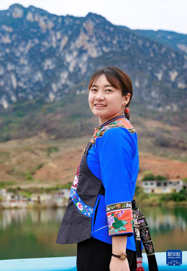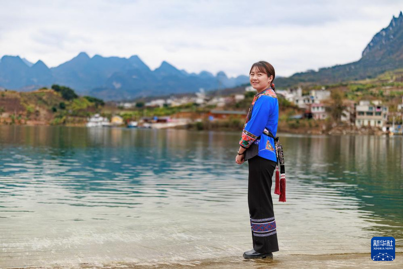 卢丹在镇宁布依族苗族自治县六马镇致富村的码头边留影(2025年2月20日摄)。新华社记者 刘续 摄