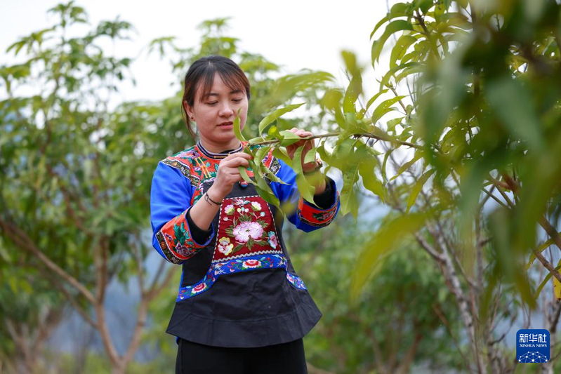在镇宁布依族苗族自治县六马镇致富村,卢丹查看芒果树生长情况(2025年2月20日摄)。新华社记者 刘续 摄
