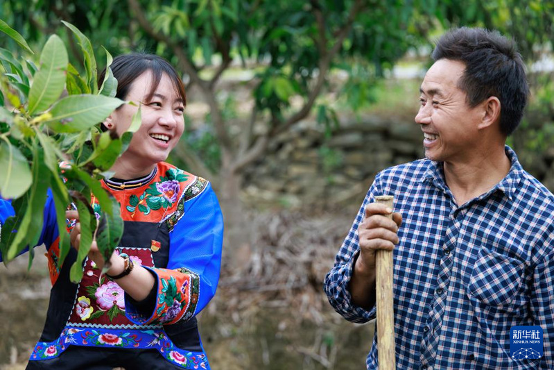 在镇宁布依族苗族自治县六马镇致富村,卢丹(左)与村民刘发志交流芒果种植情况(2025年2月20日摄)。新华社记者 刘续 摄