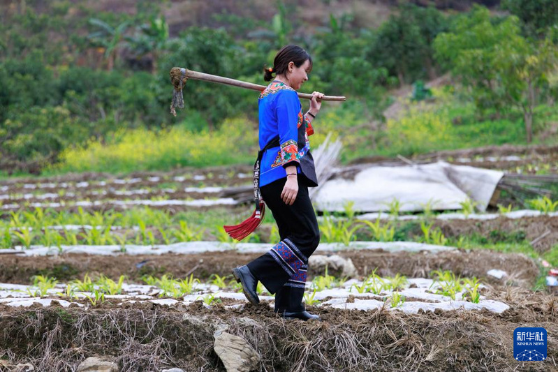 卢丹在镇宁布依族苗族自治县六马镇致富村查看农作物生长情况(2025年2月20日摄)。新华社记者 刘续 摄