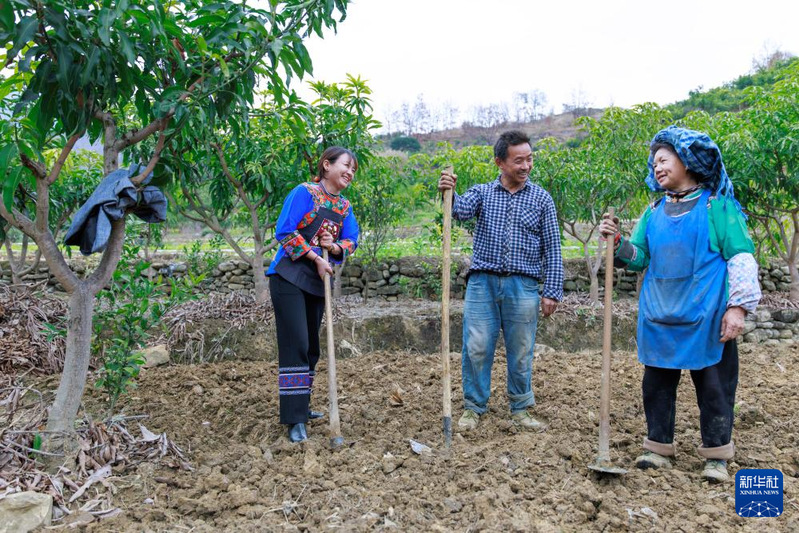 在镇宁布依族苗族自治县六马镇致富村,卢丹(中)在村民卢成敏(左)家调研蜂糖李种植情况(2025年2月20日摄)。新华社记者 刘续 摄