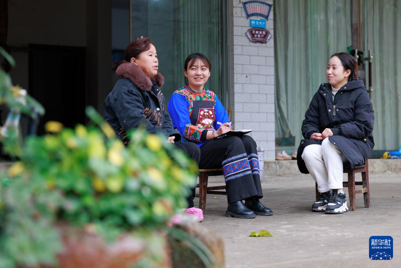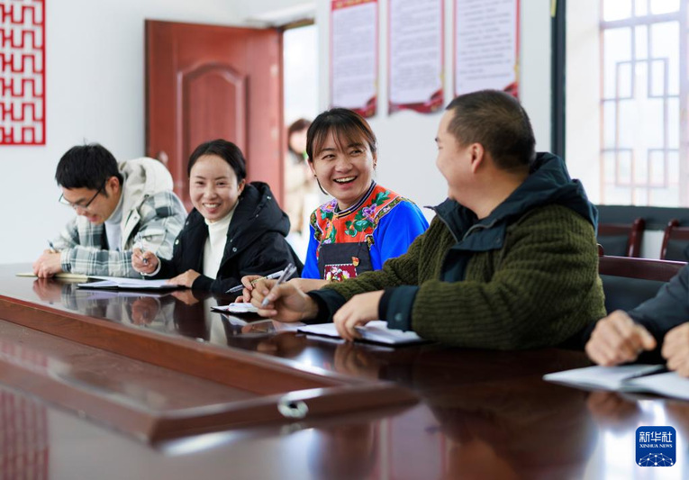 卢丹(右二)在镇宁布依族苗族自治县六马镇致富村村委会和同事交流工作(2025年2月20日摄)。新华社记者 刘续 摄
