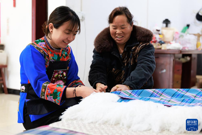 在镇宁布依族苗族自治县六马镇致富村,卢丹(左)和村民卢成敏一起编织民族特色布匹(2025年2月20日摄)。新华社记者 刘续 摄