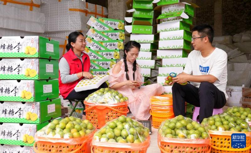 在镇宁布依族苗族自治县六马镇致富村,卢丹(左)和村民一起包装蜂糖李(2024年6月26日摄)。新华社发