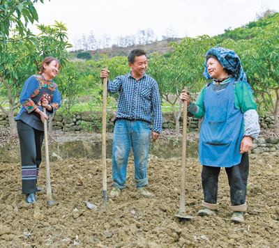 卢丹(左一)在致富村与村民交流果树种植情况。 |