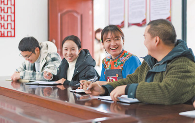 卢丹(右二)在致富村村委会和同事交流工作。 |