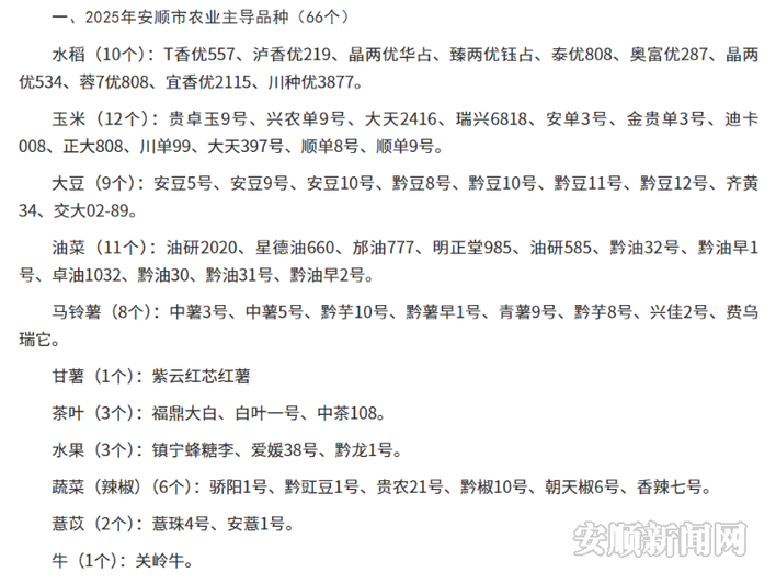 近日,记者从市农业农村局获悉,为进一步提高科技成果转化效能,推动良田良种、良机良法集成配套,加快高产优质品种和先进适用技术推广应用,促进主要作物大面积单产提升,保障粮食和重要农产品稳定安全供给,安顺市遴选出2025年农业主导品种66个、农业主推技术39项,并予推介发布。