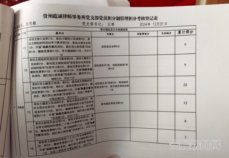 近日,记者来到贵州蕴诚律师事务所,看到支部党员积分制管理积分考核登记表上记录着每个党员律师的积分,小小“积分”彰显着每一名党员律师的责任和担当。