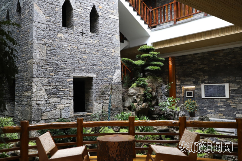 走进客栈大厅,一座屯堡风格的石头碉楼格外引人注目。刘宗彦向记者介绍:“这座石头碉楼是客栈的一大特色,由旧州当地经验丰富的手工匠人修建,耗时4个月。客栈大厅的地板所用材料则取自旧州镇此前拆除的废弃房屋,希望让踏入客栈大厅的每一位客人能真切感受到旧州镇深厚的历史底蕴与文化传承。”