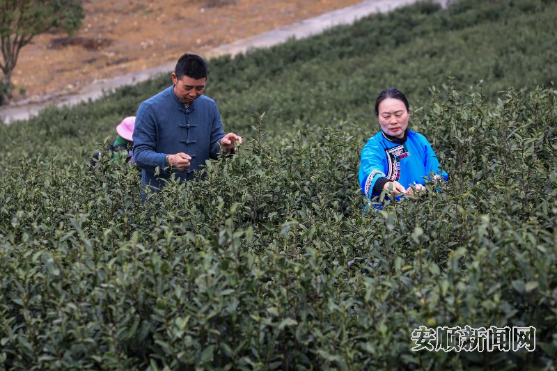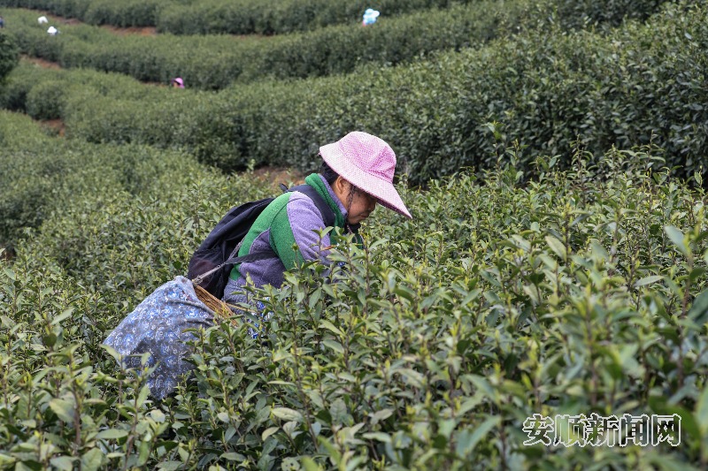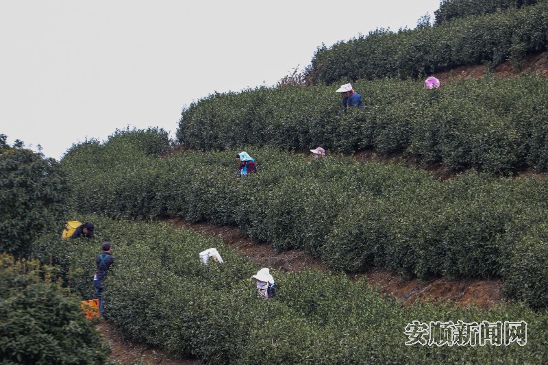 3月20日,西秀区大西桥镇志荣种植场老板冯志荣带领工人在九溪村茶山上采收春茶。天气晴好,各大种植场抓住好天气抢收新茶,供应市场。据介绍,该村已发展了2000余亩茶叶种植,10余家茶产业加工厂,为当地村民找到了一条增收致富之路。