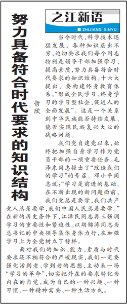 2004年3月29日,习近平同志在《之江新语》专栏的《努力具备符合时代要求的知识结构》一文中指出,“当今时代,科学技术迅猛发展,各种知识层出不穷,迫切要求我们每个同志特别是领导干部加强学习”,并要求“一定要强化活到老、学到老的思想,主动来一场‘学习的革命’,切实把外在的要求转化为内在的自觉,成为自己的一种兴趣、一种习惯、一种精神需要、一种生活方式”。这一要求放在今天,仍显前瞻意义。