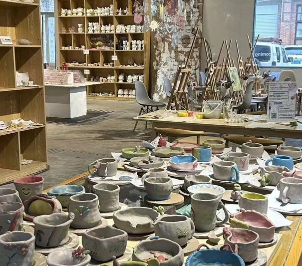 沿着厂区小道前行,记者来到了麦田艺术活动中心,负责人庄敬介绍道:“我们的店铺于2017年开始营业,考虑到印刷厂风格与店铺艺术氛围的高度契合,宽敞的厂房仓库也很适合举办活动,2023年8月便搬迁至此。在改造时,我们保留了厂房原有的木头房梁和瓦片,这些元素为店铺增添了浓厚且质朴的艺术气息。”这家以DIY陶艺、发夹与手机壳制作以及综合材料绘画等手工为主营业务的店铺,除了日常面向散客开放还承接团建活动。“不少团队看中了我们这里独特的环境以及丰富多样的手工体验项目,我们也会制定专属的活动方案,比如今年妇女节我们就为承接的团队制定了插花活动。”庄敬说。