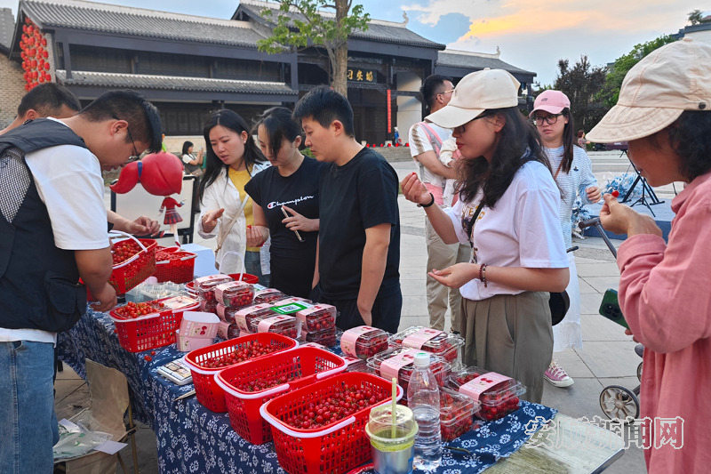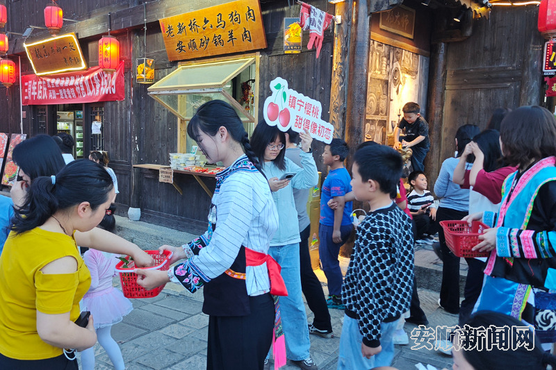 “镇宁樱桃,又红又大,甜得像初恋……”夜幕降临,安顺古城内“镇宁故事”店铺门口的樱桃摊位前热闹非凡,直播间里,主播正卖力地向观众推介着红润饱满的樱桃。身着布依族服饰的工作人员手挽竹篮,穿梭于街巷间,热情邀请过往行人品尝鲜红欲滴的樱桃。