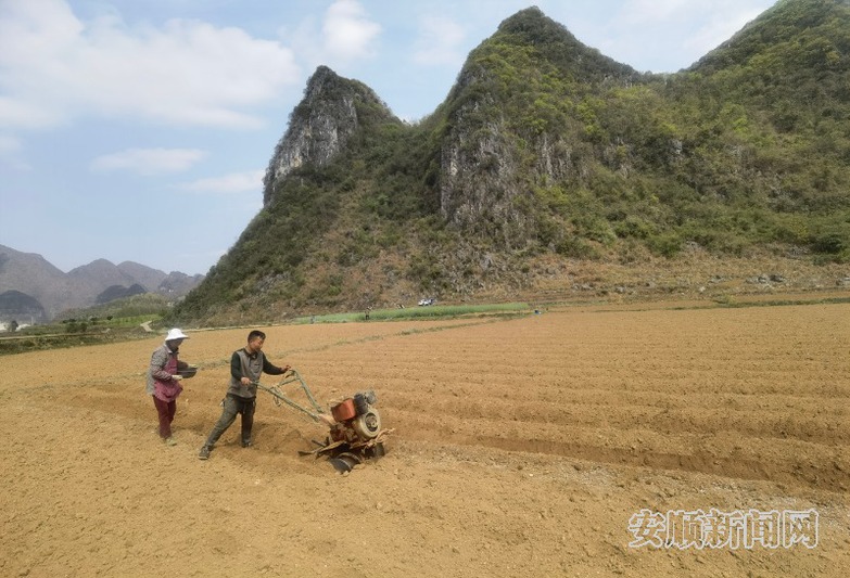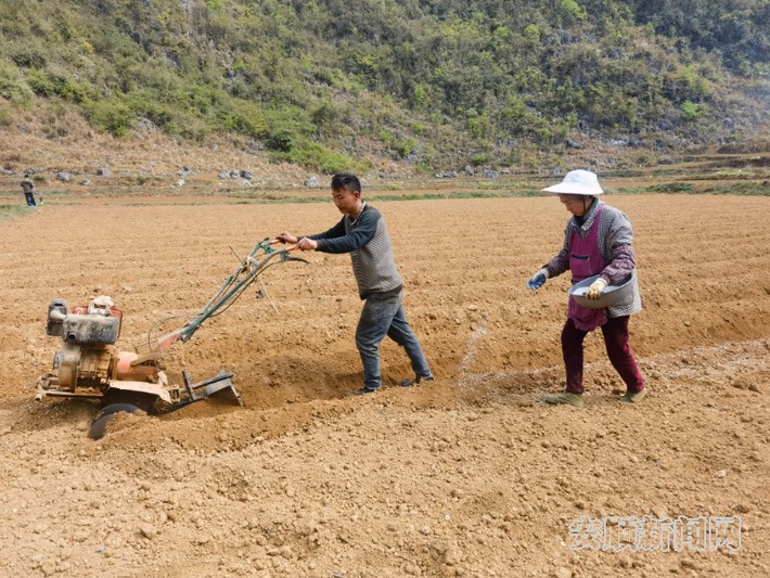 春日的紫云自治县白石岩乡,阳光明媚,在幸福园村广袤的田野间,一派繁忙的春耕景象正徐徐展开。村民韦小孟熟练地操控着微耕机翻整土地,为即将开始的玉米和红芯红薯套种做准备。