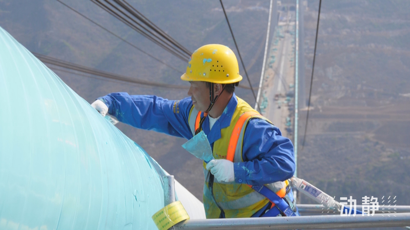 花江峡谷大桥主缆抗火防腐工程项目负责人邬惠娟说:“抗火层采用的是玄武岩纤维加工成基布,做成抗火隔热带,加入气凝胶,极大地提高了它的隔热性能;再外面是纤维阻燃密封胶带,与玄武岩纤维网格布组合在一起,形成一个高强度、高韧性、高耐候的密封层。而最外层的缠包带能够耐到1200℃的高温。”