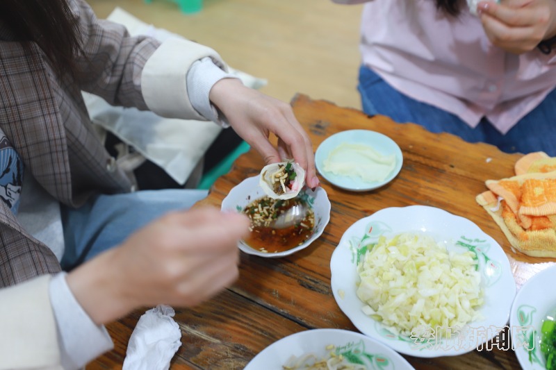 包丝娃娃时,首先把巴掌大小的面皮摊在手上,依次放入胡萝卜丝、凉面等自己喜爱的配菜,再把放好的面皮折成椭圆状,放入香脆可口的黄豆,最后浇上两勺辣椒水,味道香辣可口,让人回味至极,真是美不胜收。而包蔬的面皮又白又薄,薄到几乎可以一吹即破,但是吃在嘴里,面皮软软糯糯的,特别有弹性。