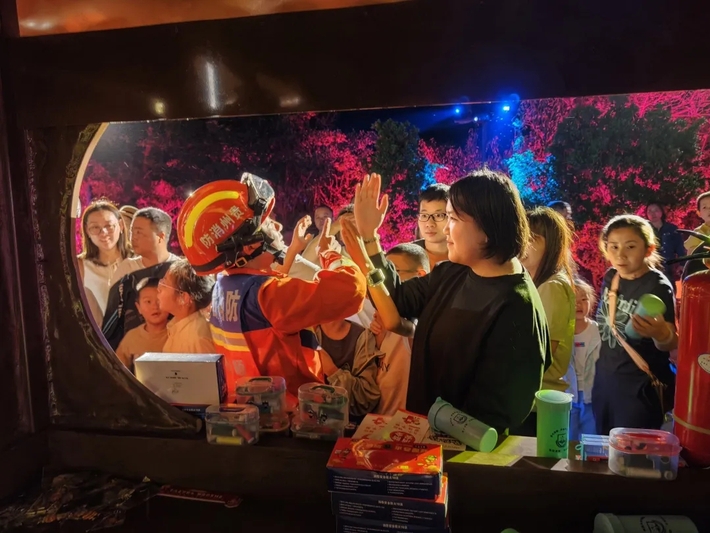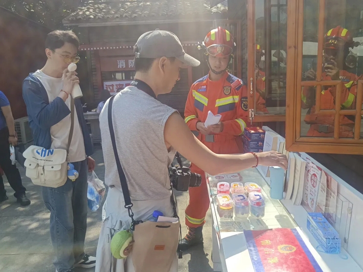 在黄果树景区,消防“蓝朋友”不仅是“安全卫士”还是“授课老师”。消防员们利用大型实景仙幻剧《再回西游》开始前的半小时,宣讲“景区禁烟要记牢,烟头火星易成灾”“手机充电别过夜,电器火灾要警惕”消防知识。并结合宣传单上的漫画案例,现场演示灭火器的使用方法,手把手教游客如何正确扑灭初期火情,还在空地处设置模拟烟雾逃生通道,让游客亲身体验火灾逃生技巧。生动有趣的讲解、沉浸式的体验,让严肃的消防知识变得通俗易懂。