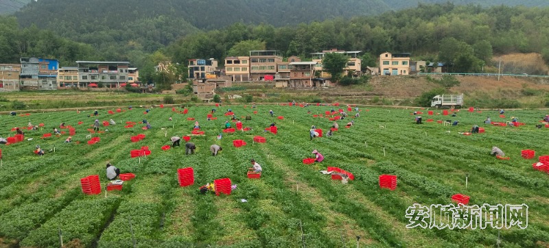 5月19日,紫云自治县四大寨乡落城村与纳容村连片的坝区蔬菜田里,数十位村民动作娴熟,将一株株香菜拔起,仔细打理后整齐地放入筐中,一片繁忙的丰收景象。