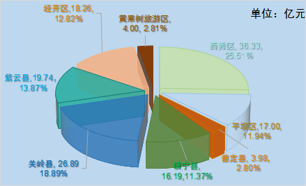 分地区看,新开工亿元以上项目中,西秀区11个,总投资36.33亿元;关岭自治县6个,总投资26.89亿元;紫云自治县6个,总投资19.74亿元;安顺经开区5个,总投资18.26亿元;平坝区3个,总投资17.00亿元;镇宁自治县4个,总投资16.19亿元;黄果树旅游区1个,总投资4.00亿元;普定县1个,总投资3.98亿元。