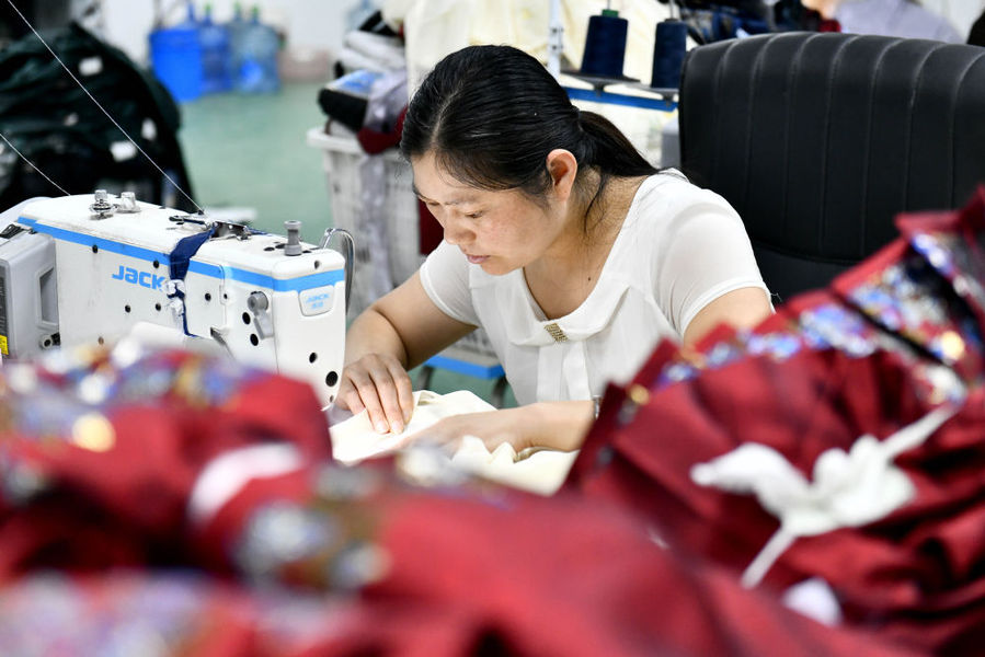 曹县工作人员在缝制汉服(2023年7月6日摄)。新华社记者郭绪雷 摄