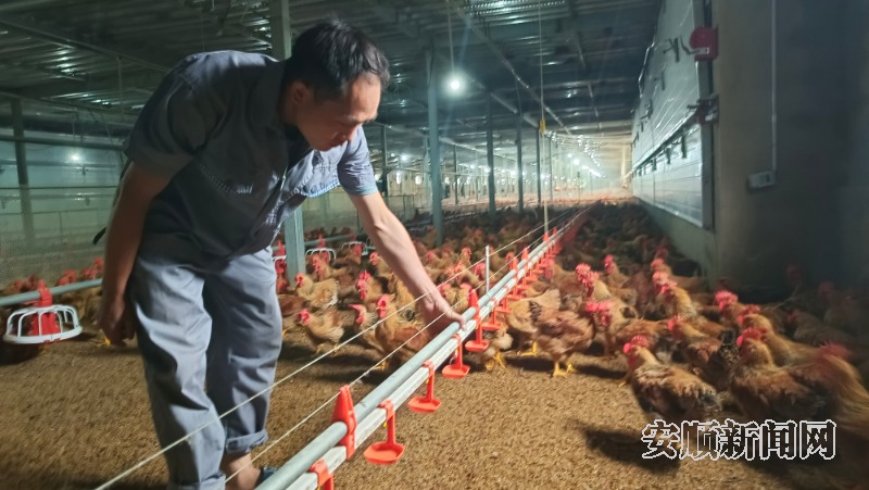 6月4日,板当镇洛麦村生态家禽养殖场内,代养户陈油如往常一样,有条不紊地给鸡群喂食、喂水,并仔细察看鸡群的长势和健康状况。